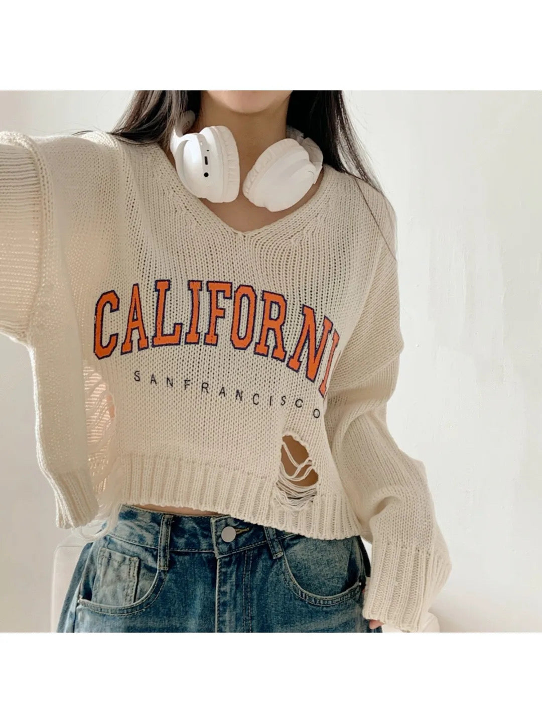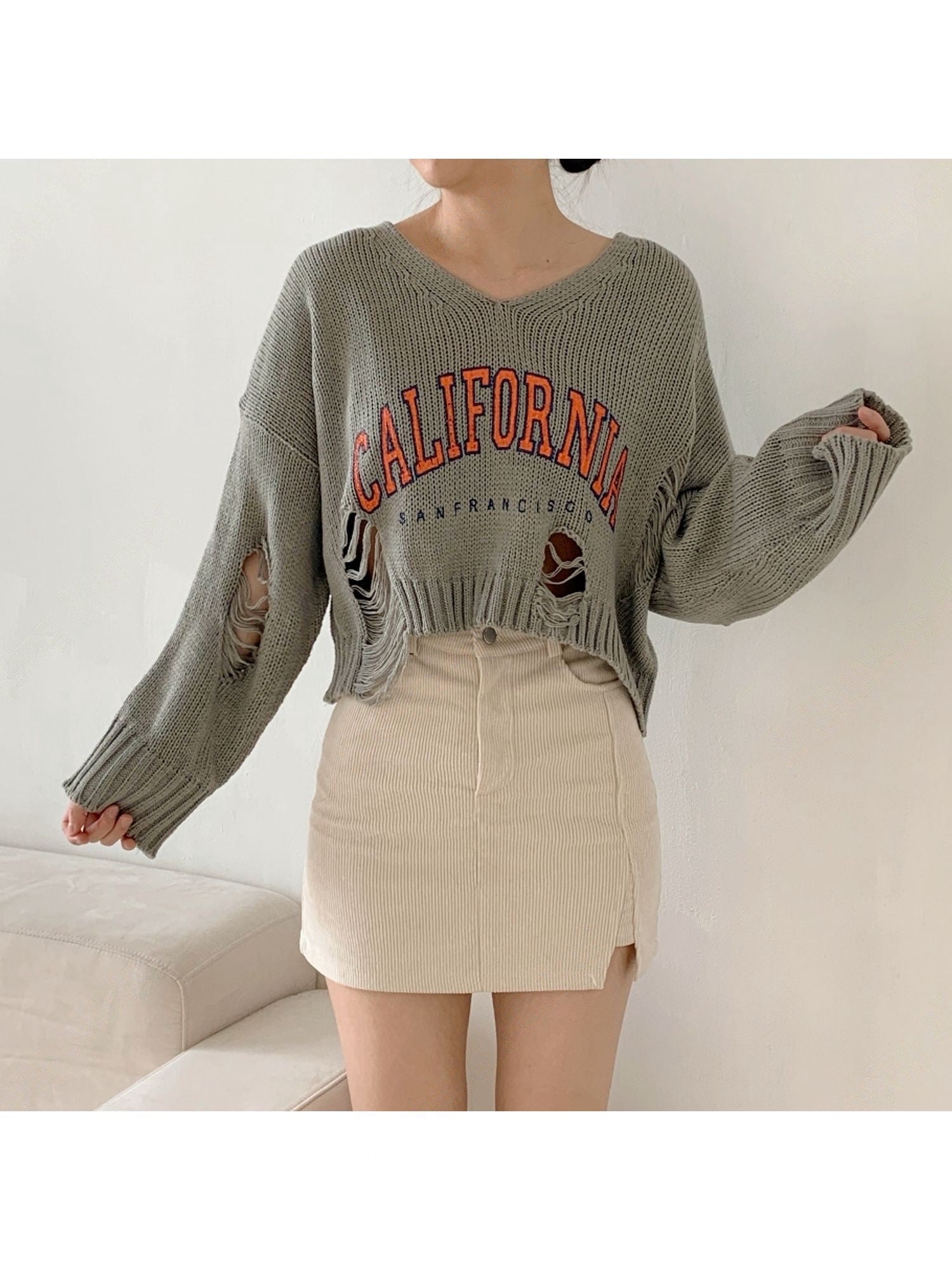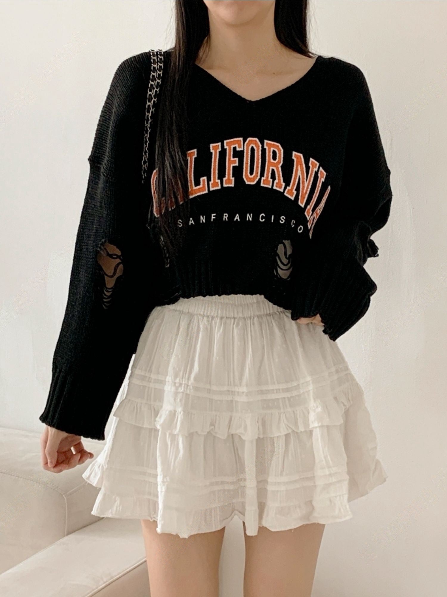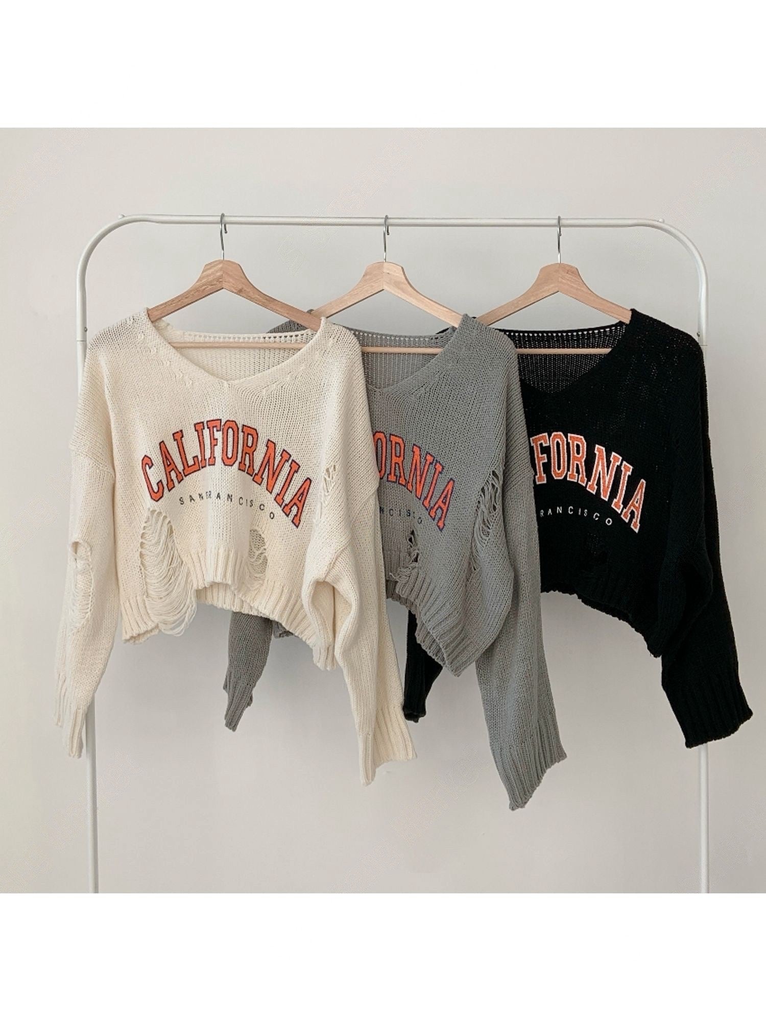 撞色字母破洞上衣
