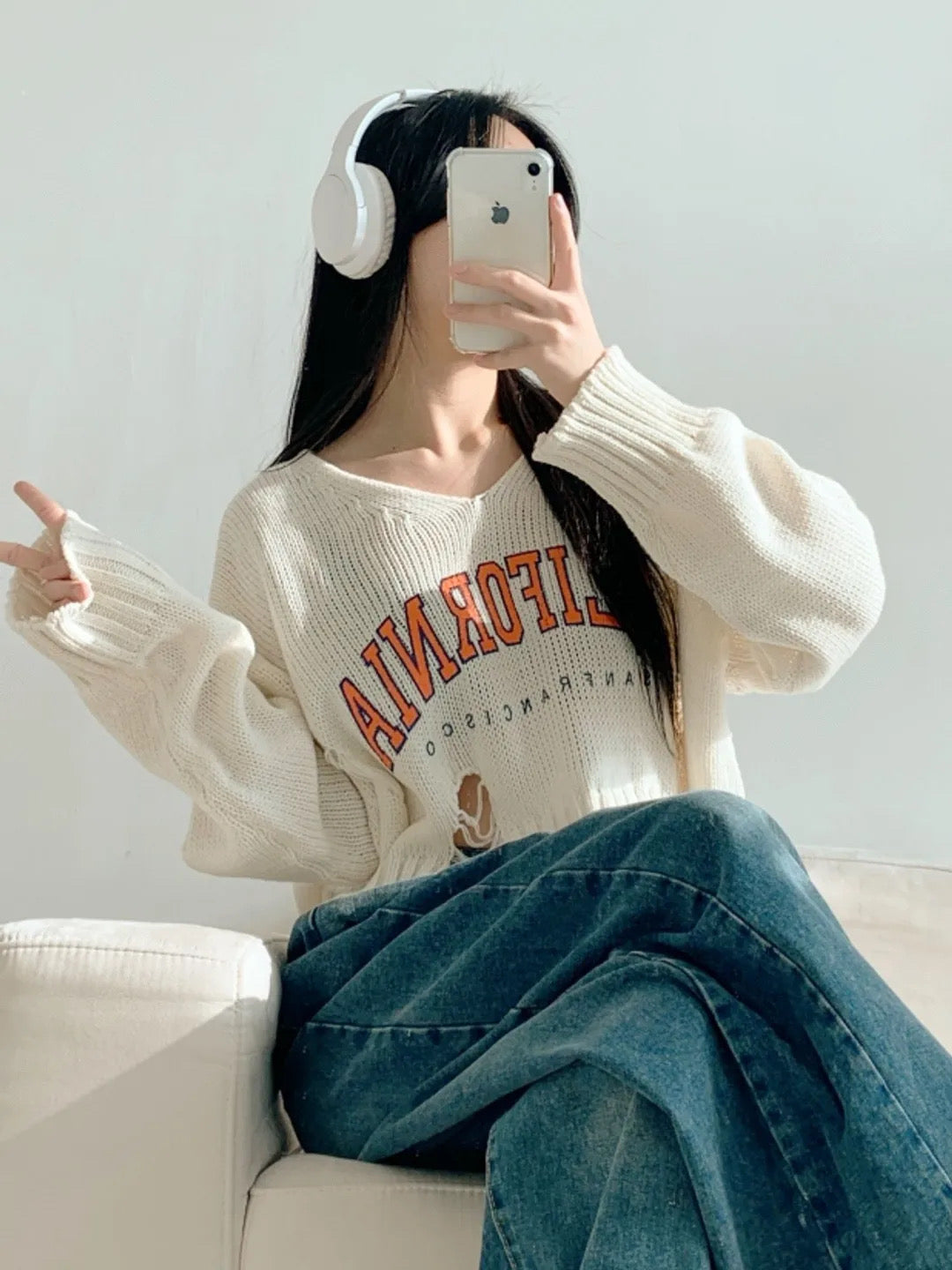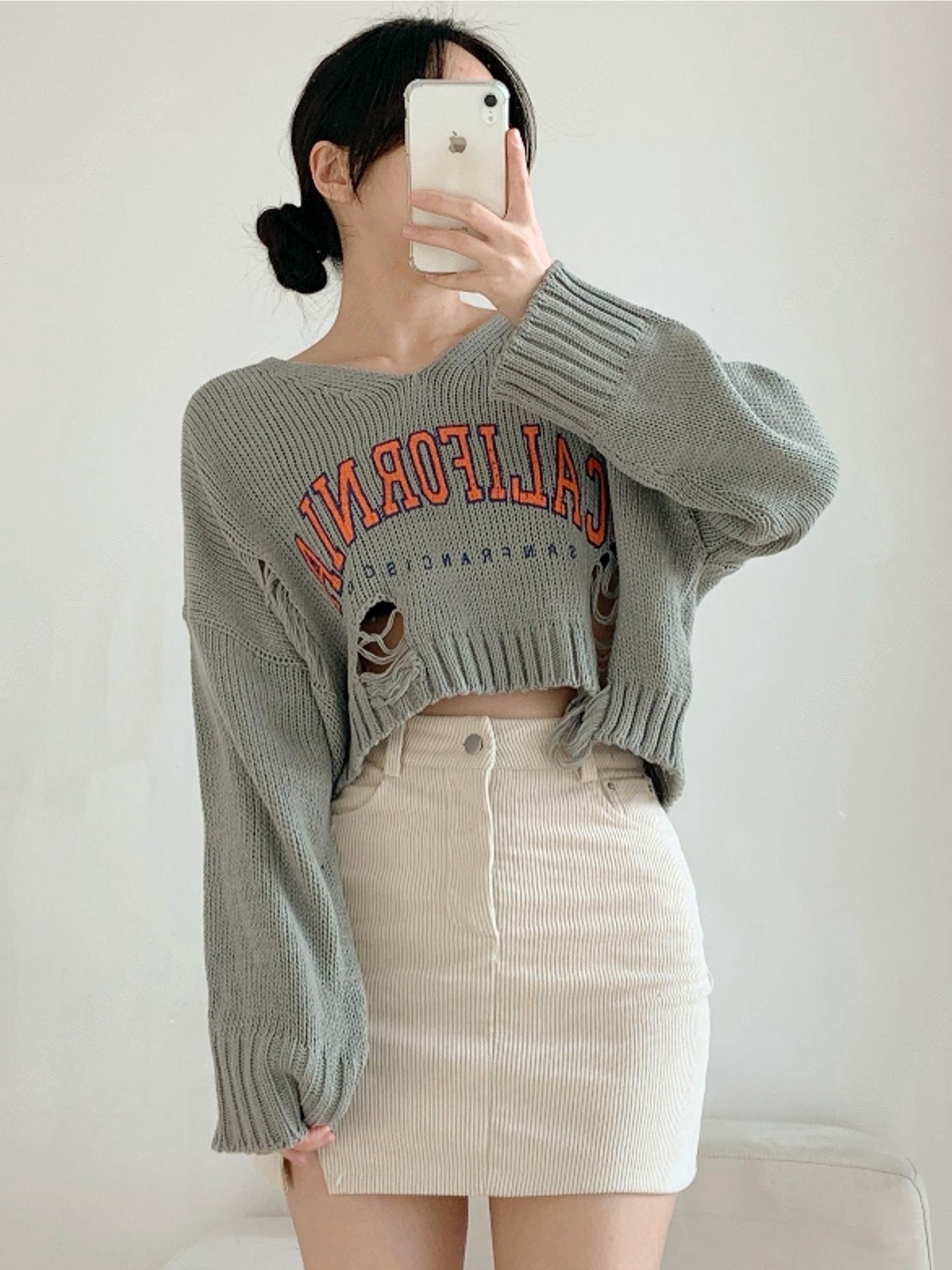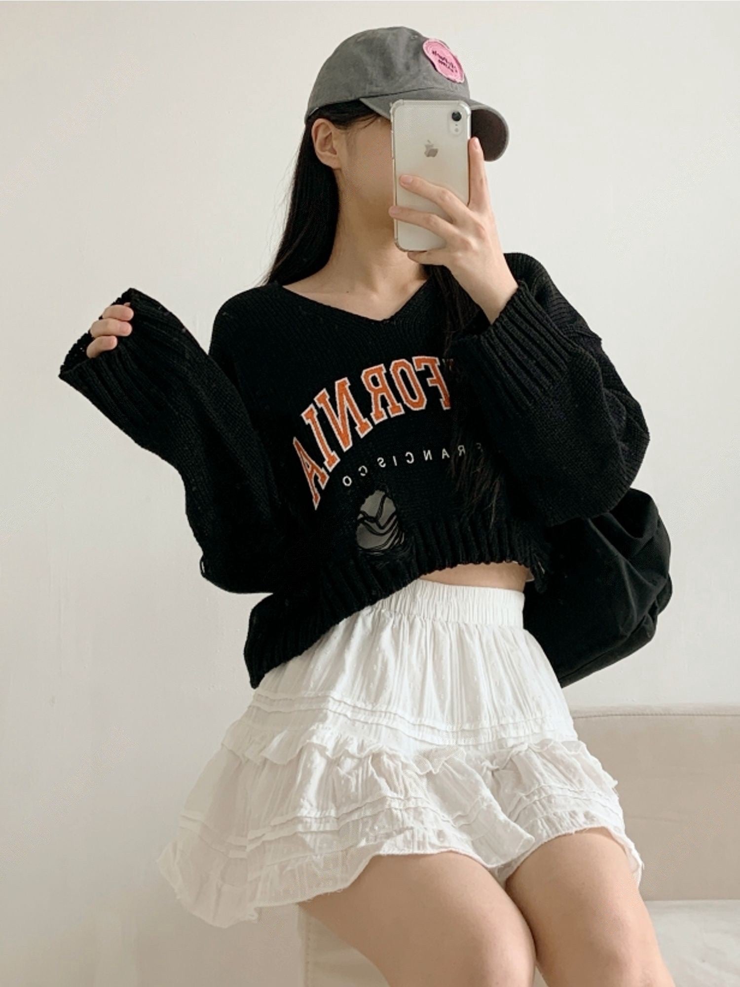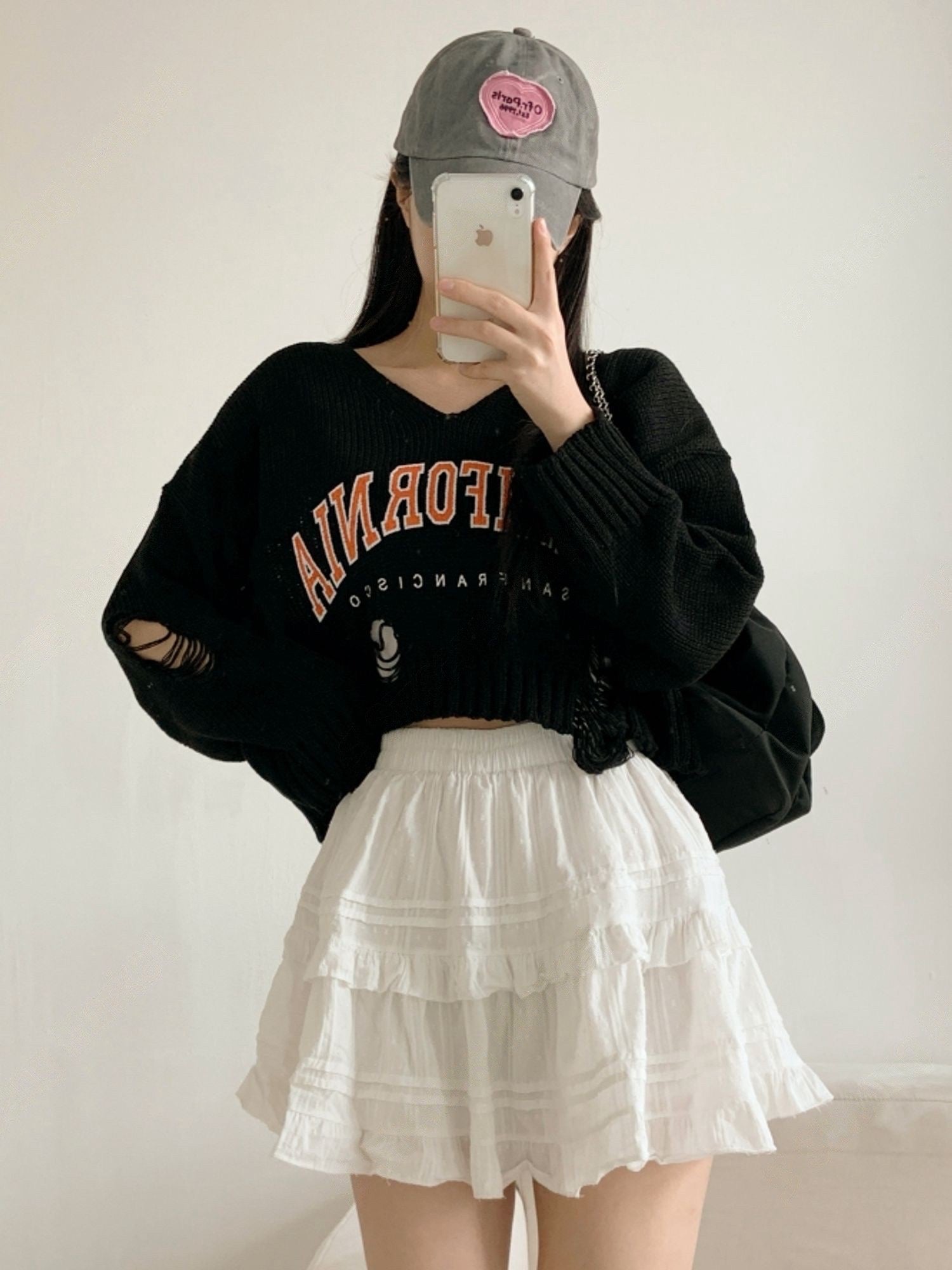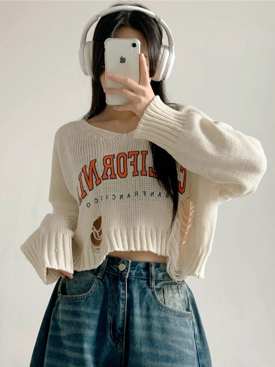 撞色字母破洞上衣